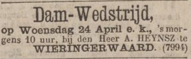 Maar laten we bij het begin beginnen. Het jaar 1878. Een kleine advertentie in de landelijke dagbladen, waaronder de Nieuws van den Dag: de aankondiging van een grote damwedstrijd in Wieringerwaard op 24 april, in het bekende Wapen, waar Heijnsz de scepter zwaaide. Er kwamen 21 deelnemers uit vooral de provincie naar het dorp en daaronder ook de toen al bekende Klaas de Heer, zoon van de in damkringen legendarische Aris de Heer uit Middenbeemster.